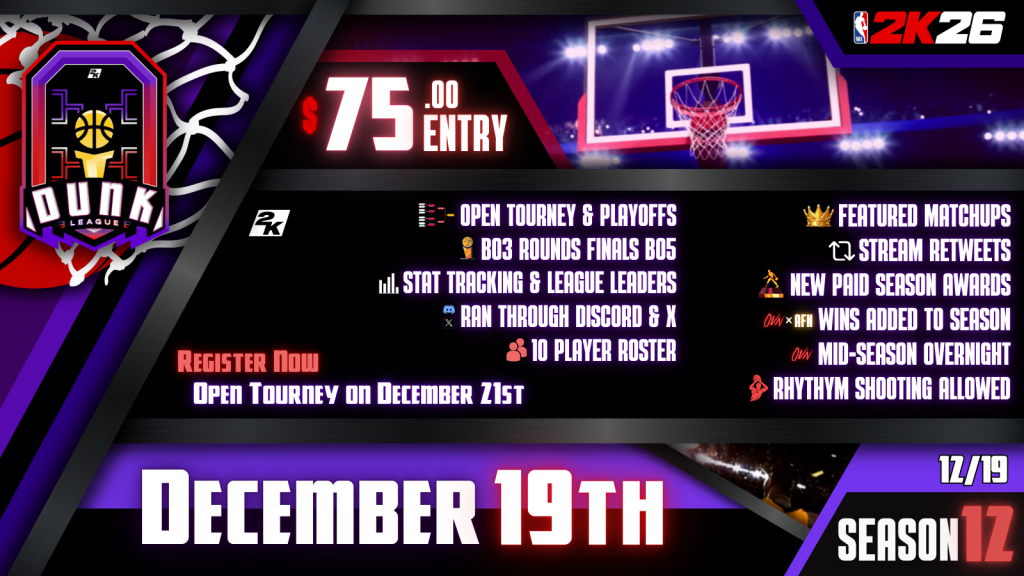 DUNK LEAGUE IS NOT ENDORSED BY, DIRECTLY AFFILIATED WITH, MAINTAINED OR SPONSORED BY NBA2K22, 2K, MICROSOFT, XBOX, SONY, OR PLAYSTATION. ALL CONTENT, GAMES TITLES, TRADE NAMES AND/OR TRADE DRESS, TRADEMARKS, ARTWORK AND ASSOCIATED IMAGERY ARE TRADEMARKS AND/OR COPYRIGHT MATERIAL OF THEIR RESPECTIVE OWNERS.